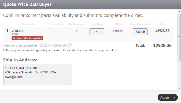 In the Quote Price D2D Buyer dialog, review the parts quantity and pricing information for each requested part number: