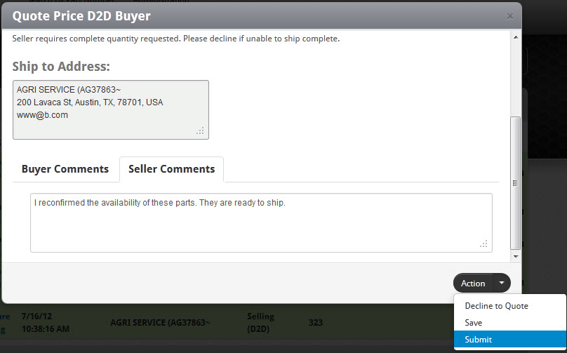 If you wish to accept the sale terms of the quote, select the Submit option from the Action dropdown menu.